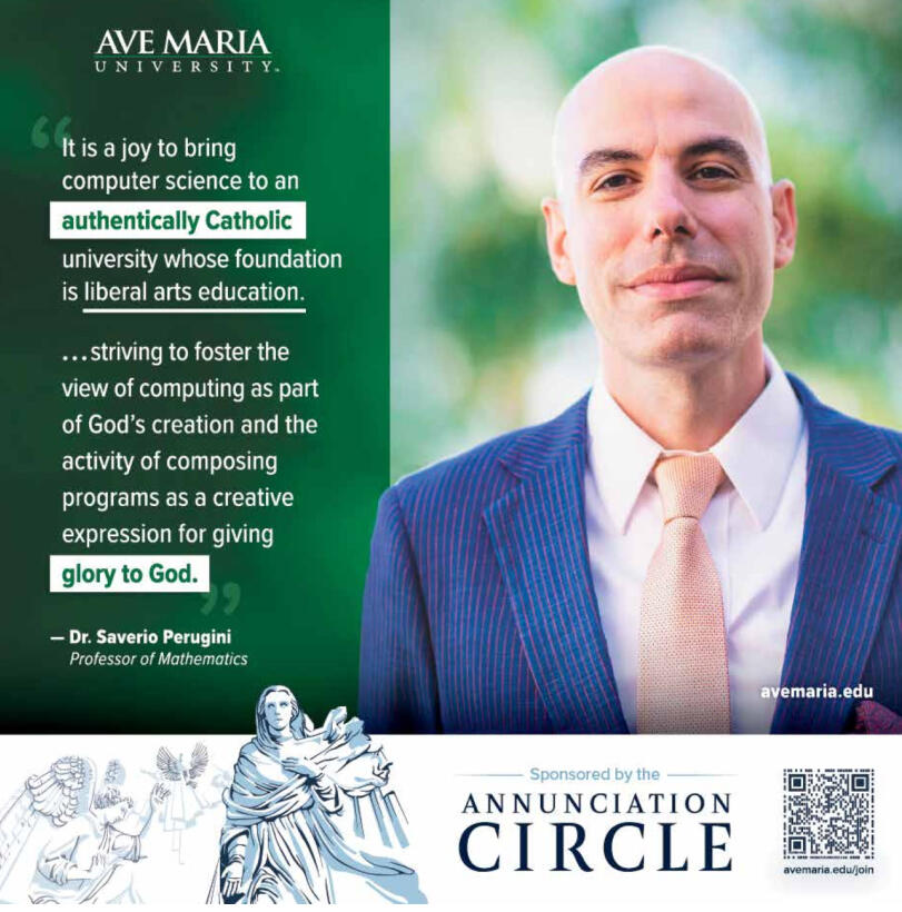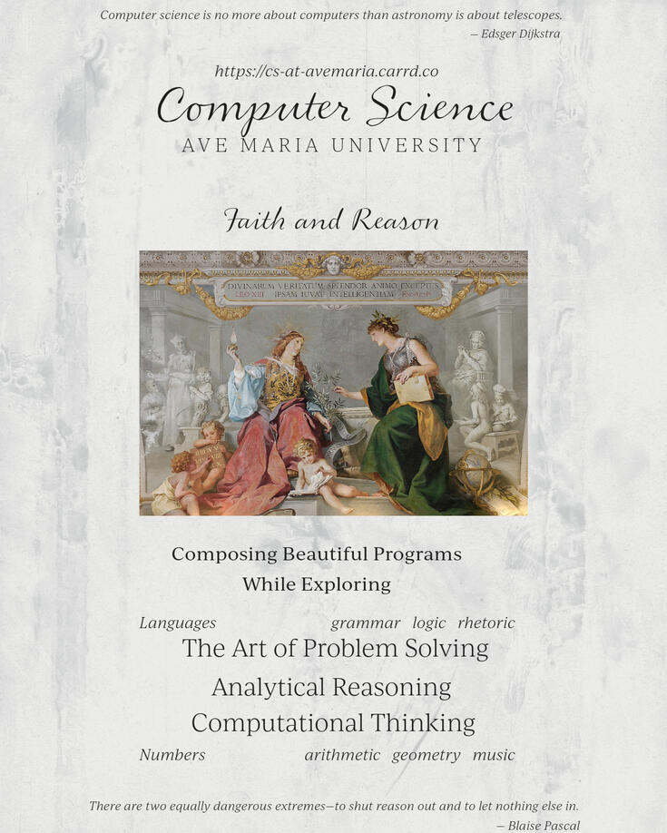 Can you tell me a little bit more about computer science and the computer science program at Ave Maria University?Absolutely. We have a webinar about the new computer science program at Ave Maria University that we encourage you to watch.What will my course load look like each semester as a computer science major?There are a variety of four-year, semester-by-semester course plans for pursuing a degree in computer science, with options for double majoring with mathematics or physics or minoring in data analytics, available here.I could study computer science at a variety of other universities. What makes the computer science program at Ave Maria University different?We teach computer science from an authentically Catholic perspective. What this means is that we are pursuing it neither for purely utilitarian purposes nor in isolation from other important disciplines such as philosophy and theology. We are pursing it for more liberal purposes—to learn about our Creator and His creation, to unite faith and reason, to unite beauty and utility, and to give glory to God through the creative expression of composing beautiful programs.“The Catholic Church has a history of engaging the sciences even as it has cautioned misapplication of those sciences in theories which do not have enough evidence or in fads which die out.”3Right now what the world is sorely lacking is science and engineering professionals who know their Catholic faith and know that it is consistent with reason, science, etc. We teach our students the truth that faith and reason mutually reinforce each other and we cannot have one without the other. The seventeenth century French philosopher, mathematician, and scientist Blaise Pascal said: “There are two equally dangerous extremes—to shut reason out and to let nothing else in.”Lastly, while one should not pursue studies of computer science for purely utilitarian purposes (e.g., to get a job, make lots of money, etc.), we must acknowledge that part of studying computer science involves the consideration of how one will put the knowledge learned into practice. As we all know job opportunities in computing are ample and the compensation is high. Thus, the study of computer science at Ave Maria University is an educational pathway to help young, practicing, faithful Catholics start, support, and sustain strong Catholic families, communities, and apostolates.This is what makes a computer science degree from Ave Maria University unique.(The short article I wrote in Spring 2022 about the new computer science program offers other insights into this question.)There are a variety of free computer science courses online (e.g., Python, Full Stack Web programming, Machine learning, etc.). Why should I attend (and pay for) university when I can study these topics online, at my own pace, and at home?The reality is that most undergraduates cannot learn this challenging material on their own and demonstrate both a deep understanding of it and the ability to put it into practice in a software development context. This is based on my twenty-plus years of experience teaching computer science to undergraduate students.A common theme of my teaching evaluations is manifested through a comment that continues to recur in my teaching evaluations: “I have tried to learn this material before on my own numerous times and I have never learned it as well as I learned it in this course. I now have much deeper understanding of the concepts.”What type of computer is required for the program? And which operating system and software is required?While my preference is that you have an Apple MacBook, any Windows laptop will be fine. However, do not get a Chromebook. Most of the software we use in the program is open source and we can help you acquire and install it once you arrive on campus.What is the career outlook for software developers and computer programmers?...Should I be worried that AI is going to make software developers obsolete?In general, no and especially not at the moment, no.The headlines and hype surrounding this topic have certainly been sensational. We have read that in the all-too-close future coding will be done by deep programming systems and programmers will effectively become specification writers detailing using natural language to specify the type of code they want the computer to spit out. Not so fast.6^Here are multiple reasons why I do not think deep programming systems will entirely replace human software developers any time soon. - AI is not there yet. Currently, generative AI chatbots or deep programming systems can write programming code for the types of tasks performed by junior-level developers (and that type of code has been accessible on the web through Google searches for years). AI chatbots are not as effective at generating code that integrates multiple software systems or addresses detailed nuances of programming or software specifications.I was recently asked to analyze the code repository for a production-level e-commerce web application that has not been updated in five years or so. The application consists of multiple software systems that need to talk to each other. It was using outdated versions of open-source APIs (application programming interface) and off-the-shelf subcomponents that are no longer being maintained. In other words, the code was a mess. It has incurred what software developers call technical debt. So the question was: do we try to nurse it back to health using patches (computer science lingo for duck tape) or start over. At the moment, a system like ChatGPT cannot answer this question, automatically patch the system if the former option is preferred, or generate the new code if the latter option is chosen. Whether we are talking about AI systems that generate code, understand natural language, or drive cars, there are always a variety of so called “edge cases”—situations that programmers didn’t anticipate and the AI system is not